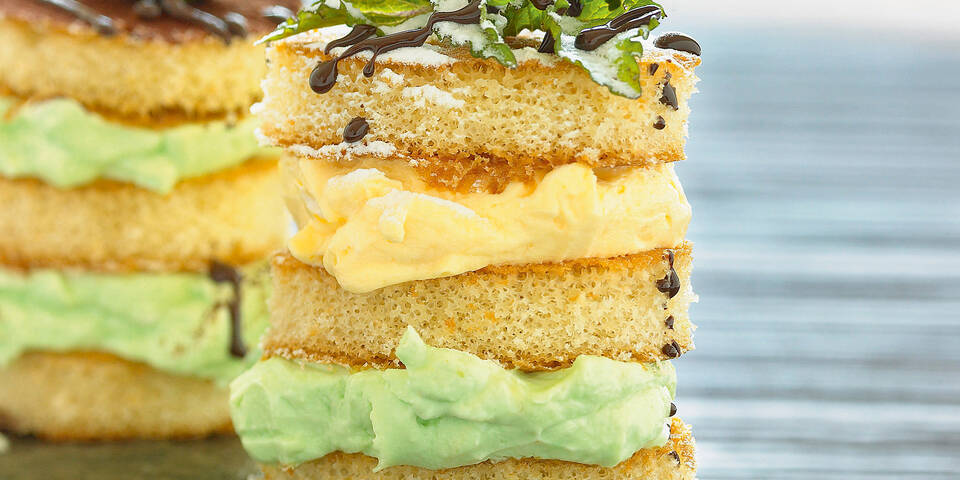 - Aus dem Biskuit mit einem runden Ausstecher (6 cm Durchmesser) Kreise ausschneiden. Die Kreise mit den Cremen bestreichen und dabei je 3 Kreise übereinanderstapeln. Nach Belieben mit Staubzucker bestauben und nach Belieben mit geschmolzener Schokolade, Minze und Limettenscheiben garniert servieren.