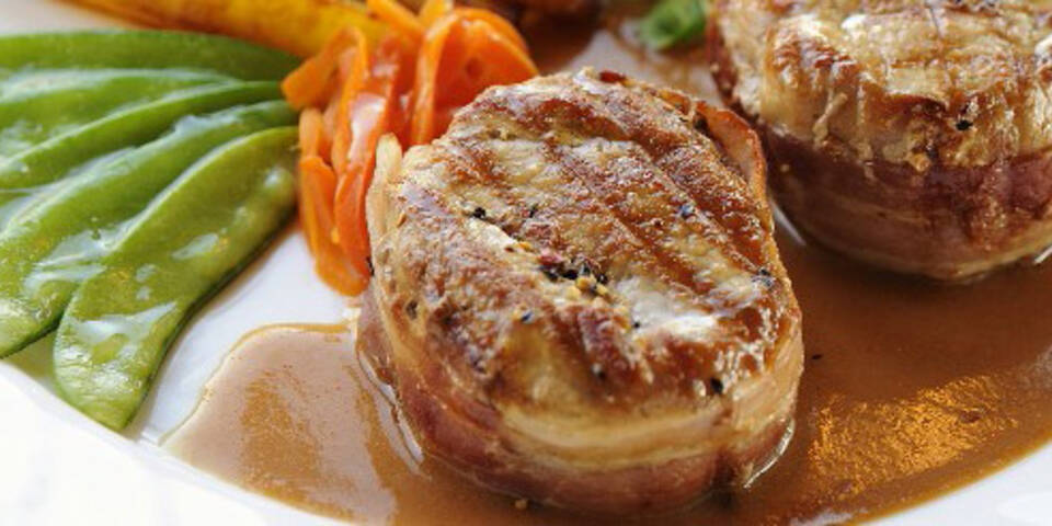 - Den Bratensatz mit dem Kalbsfond ablöschen, unter Rühren mit einem Schneebesen lösen und einreduzieren lassen. Die Butter einrühren und nach Belieben mit etwas in kaltem Wasser angerührter Stärke abbinden. Die Sauce mit Salz und Pfeffer abschmecken, die Medaillons wieder hineinlegen und servieren.