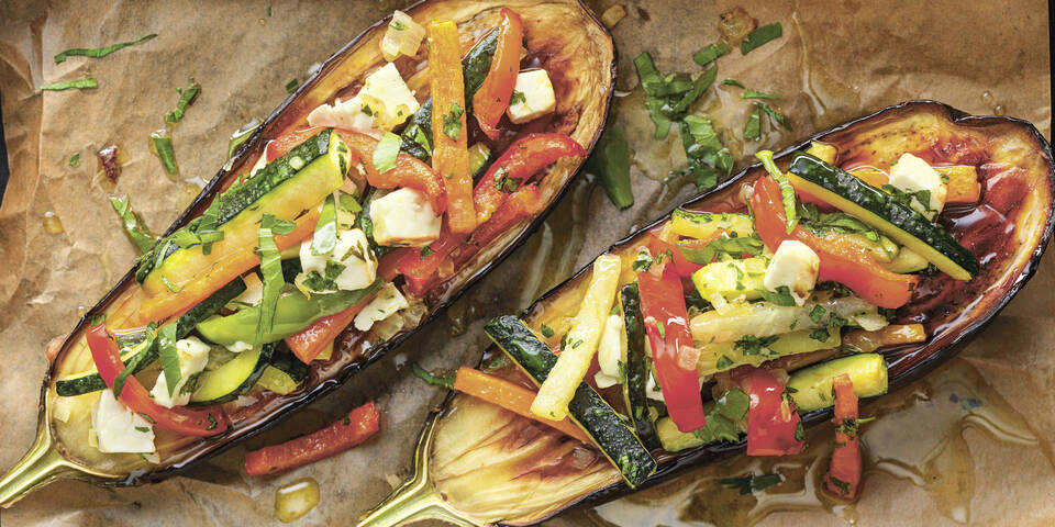 Melanzani gefüllt mit buntem Gemüse