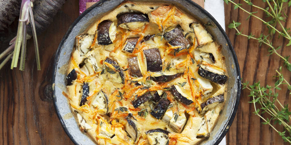 - Thymian abbrausen und die Blättchen abstreifen. Melanzani waschen, putzen, längs vierteln und ca. 2 cm dicke Stücke schneiden. Karotten schälen und grob raspeln.