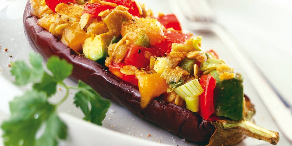 - Mit dem Gemüse füllen und mit dem Cheddar bestreuen. Eine geölte Backform mit dem restlichen Gemüse auslegen, salzen und pfeffern. Melanzanihälften darauf setzen und im Ofen ca. 35 Minuten goldbraun überbacken.