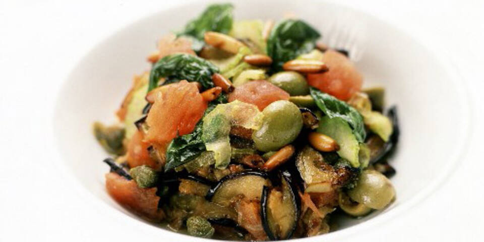 - Das Gemüse im Olivenöl andünsten, salzen, pfeffern und zugedeckt bei mittlerer Hitze 5 Minuten garen. Inzwischen die Oliven halbieren und mit Basilikum, Essig, Zucker und Kapern zum Gemüse geben. Das Ganze weitere 15 Minuten garen, bis alles sämig eingekocht ist. Mit Pinienkernen bestreut servieren.