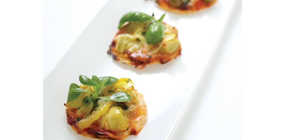 Schinken und Artischocken in feine Streifen oder Scheiben schneiden. Knoblauch schälen und in Streifen schneiden. Teig ausrollen und kreisförmig ausstechen. Teig dünn mit Olivenöl bestreichen, mit Paradeisern und Pizzakäse belegen. Pizzas mit Thunfisch, Kapern, Artischocken, Schinken und Knoblauch belegen, salzen und pfeffern.
