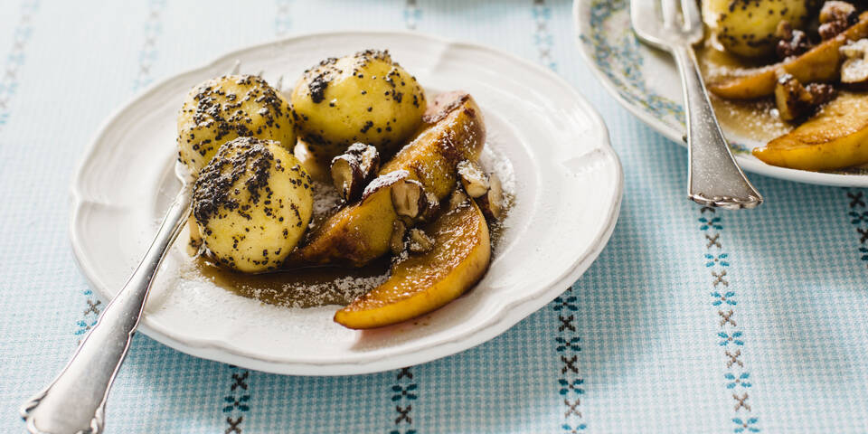 - Die Knödel mit einem Schaumlöffel aus dem Wasser heben und kurz abtropfen lassen, dann in der Mohnbutter schwenken. Die glasierten Quitten leicht erhitzen, die Mohnknödel damit anrichten und servieren.