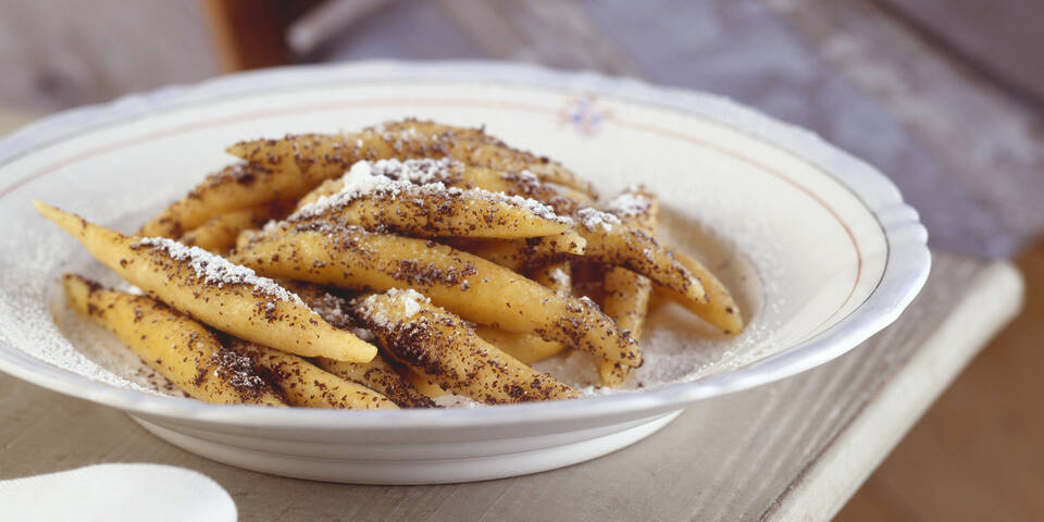 Die Butter in einer Pfanne zerlassen, die Schupfnudeln hineingeben und kurz anbraten. Mit dem Mohn bestreuen, schwenken und auf Teller angerichtet und mit Staubzucker bestaubt servieren.