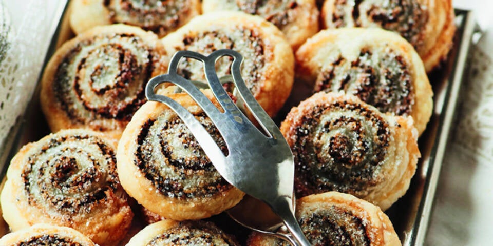 4. Den Blätterteig auf einer bemehlten Arbeitsfläche dünn ausrollen. Den Mohnback mit der Butter, der Milch, dem Zimt und den Nüssen verrühren. Den Blätterteig mit der Mohnmasse bestreichen. Von der Längsseite her locker aufrollen.