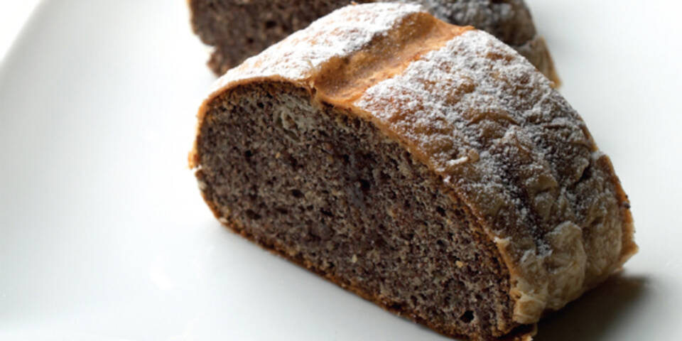 Teig gut mit Mehl bestreuen und mit einem Rollholz länglich ausrollen. Ein großes Tuch mit Mehl bestreuen. Strudelteig über dem Tuch mit bemehlten Handrücken so dünn wie möglich auf eine Größe von 60 mal 70 cm ausziehen und auf das Tuch legen. Teig mit geschmolzener Butter beträufeln. Die Mohnmasse im unteren Drittel des Strudelteigs gleichmäßig aufstreichen. Mithilfe des Tuchs einen Strudel rollen. Zwei Formen mit zirka 33 cm Länge mit Butter ausstreichen. Strudel in zwei Teile schneiden und mithilfe einer Palette oder Teigkarte in die gebutterten Formen geben.