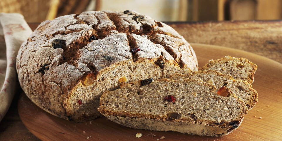 - Aus dem Teig ein ovales Brot formen und aufs Blech setzen. Mit einem scharfen Messer einschneiden und 30–40 Minuten zugedeckt an einem warmen Ort gehen lassen. Den Backofen auf 220 °C Umluft vorheizen. Das Brot zunächst ca. 10 Minuten backen. Dann die Temperatur auf 200 °C reduzieren und 40 Minuten weiterbacken. Das Brot mit 2 EL Öl bestreichen und in 10 Minuten fertig backen. Nach dem Backen auf ein Kuchengitter stürzen und auskühlen lassen.