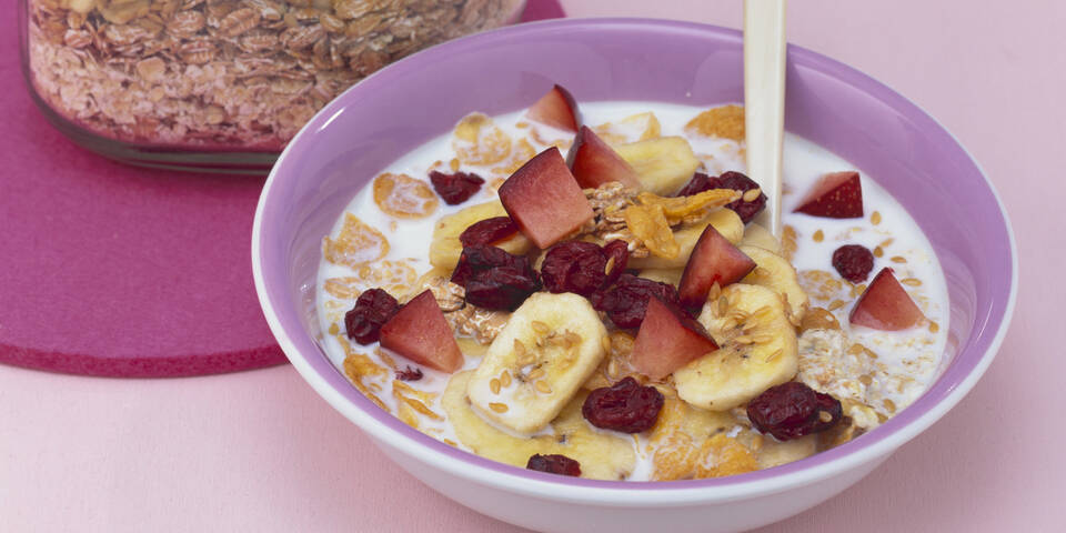 Alle Müslizutaten in einer Schüssel miteinander mischen und in ein Schraubglas füllen. Pro Portion 4 EL Müsli in eine Schüssel geben. Mit 100 g frisch geschnittenem Obst und Milch servieren.