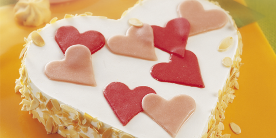 - Für die Garnitur, Marzipan auf einer Arbeitsfläche mit einem Rollholz dünn ca. 2 mm ausrollen und daraus mit einem Ausstecher (3 cm Durchmesser) Herzen ausstechen. Torte mit einem kleinen Messer vom Rand der Form lösen, Form abheben.