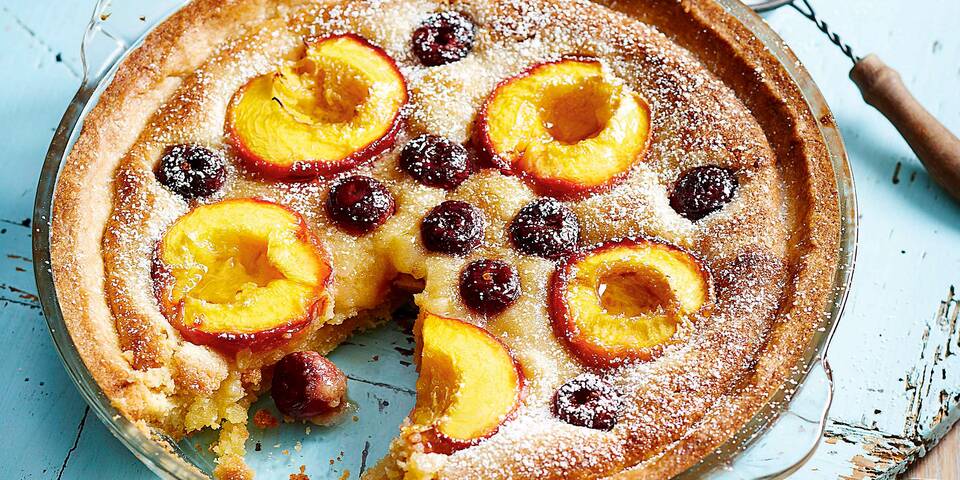 - Die Nektarinen abwaschen, halbieren und den Stein entfernen. Die Kirschen waschen und entsteinen. Beides auf dem Guss verteilen. Für weitere ca. 35 Minuten goldbraun backen. Danach auskühlen lassen und mit Staubzucker bestaubt servieren.