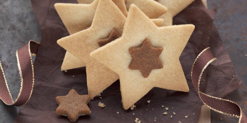 - Teig jeweils auf bemehlter Arbeitsfläche 3 mm dünn ausrollen. Aus dem hellen Teig große und aus dem Nougatteig kleine Sterne ausstechen, auf das Backblech legen. Im Backofen (Mitte) 10 Minuten goldbraun backen. Kekse dann vorsichtig auf ein Kuchengitter setzen und auskühlen lassen. Staubzucker mit dem Zitronensaft zu einem dickflüssigen Guss anrühren. Jeweils einen Tupfer auf die Mitte der großen Sterne setzen und darauf die kleinen Sterne legen. Leicht andrücken und fest werden lassen.