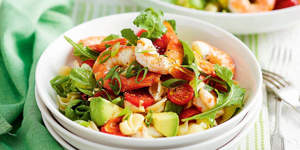 - Die Frühlingszwiebeln waschen, putzen und leicht schräg in Ringe schneiden. Die Avocado schälen, halbieren, den Kern entfernen und die Hälften in kleine Stücke schneiden. Die Garnelen abbrausen, trocken tupfen und in einer heißen Pfanne in einem Esslöffel Öl 3 Minuten braten.
