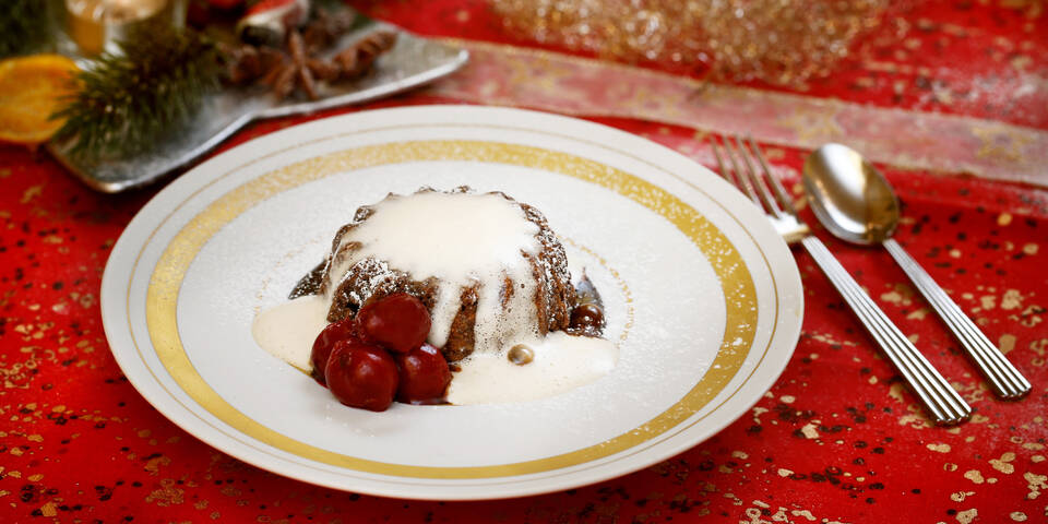 - Für die Soße Zucker mit 200 ml Wasser bei kleiner Hitze 10 Minuten köcheln lassen. Vom Herd ziehen, gesiebten Kakao und Schlagobers mit dem Schneebesen nach und nach einrühren. Topf wieder auf den Herd stellen und einige Minuten bei kleiner Hitze köcheln lassen. Vom Herd nehmen, die Soße durch ein Sieb in ein Gefäß sieben und erkalten lassen.