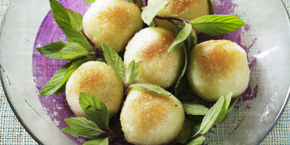 - In die Mitte etwas Obst setzen und erneut zu Knödeln formen. Diese in siedendes Wasser geben und ca. 20 Minuten ziehen lassen. Dabei die Knödel gelegentlich anstoßen, damit sie sich drehen.