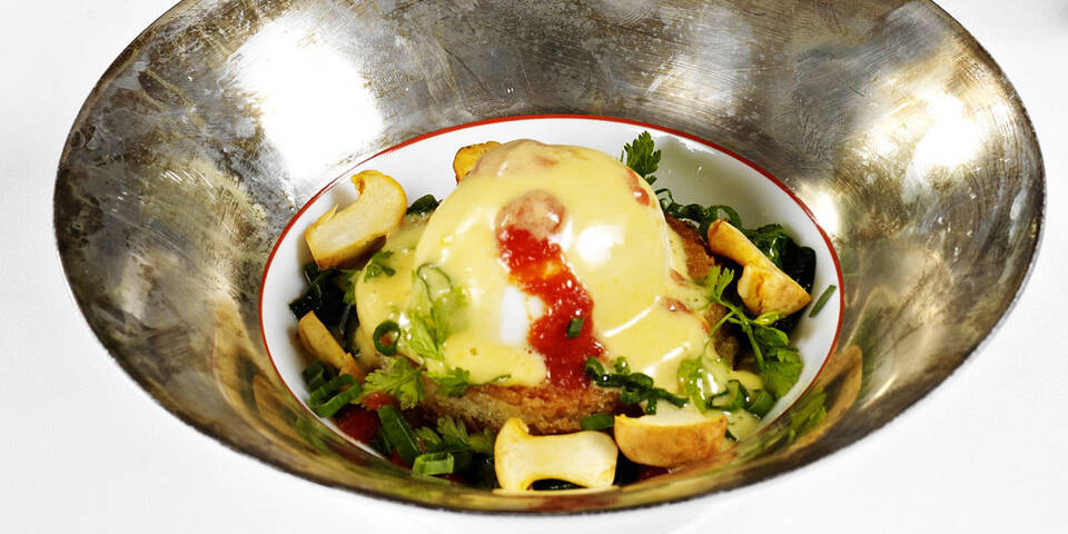 Platzieren Sie in der Mitte eines Suppentellers den Briochetoast, darauf den Blattspinat. Übergießen Sie diesen mit Paradeissugo und setzen darauf das pochierte Ei. Abschließend gießen Sie die Sauce Bernaise darüber und garnieren das Gericht mit einigen Basilikumblättern.
