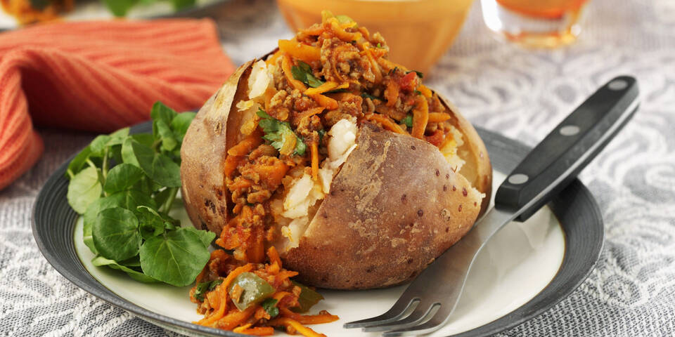 - Ist beim Einstechen mit einer Gabel in die Erdäpfel kein Widerstand mehr zu spüren, sind sie gar. Die Erdäpfel aus dem Ofen nehmen, vorsichtig auspacken, kreuzweise einschneiden und auf Teller legen. Das Chili darüber verteilen und servieren.