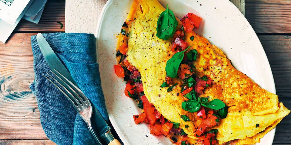 - Die Pfanne erhitzen und Butter oder Kokosöl zerlassen. Die Eiermasse in die Pfanne geben und die Temperatur senken. Gelegentlich die Ränder des Omeletts vom Pfannenrand abheben und die noch flüssige Eiermasse in die Pfanne gleiten lassen. Wenn die Eiermasse an den Seiten gestockt ist, die Füllung auf die eine Hälfte geben und das Omelett zusammenklappen. Danach auf beiden Seiten braten, bis es rundherum fest ist.
