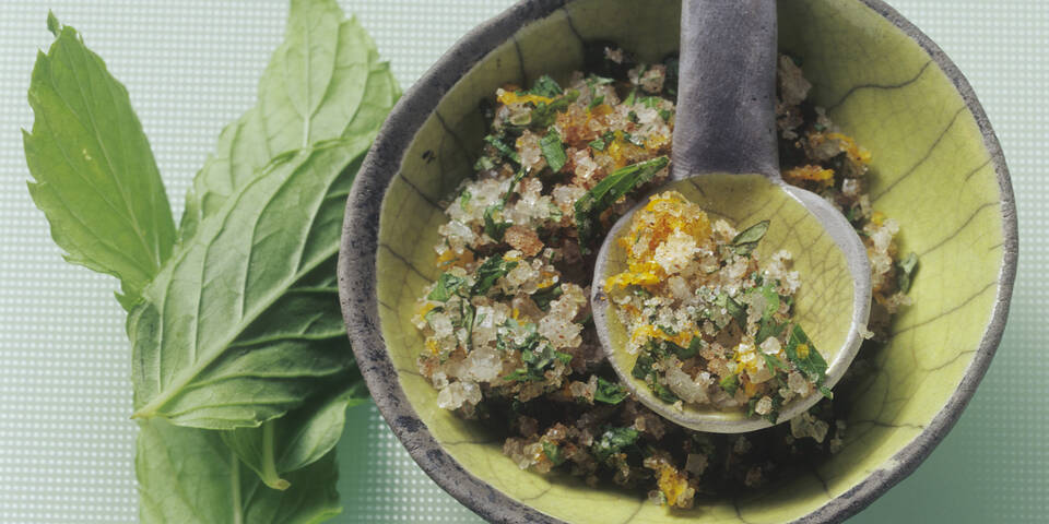 Die Orange heiß waschen, trocken tupfen und die Schale abreiben. Die Petersilie und die Minze abbrausen, trocken tupfen und die Blätter abzupfen. Beides grob hacken und mit dem Zimt sowie dem Orangenabrieb unter das Salz mengen. In ein gut verschließbares Glas füllen. Passt sehr gut zu Lamm, Schwein und Rind.