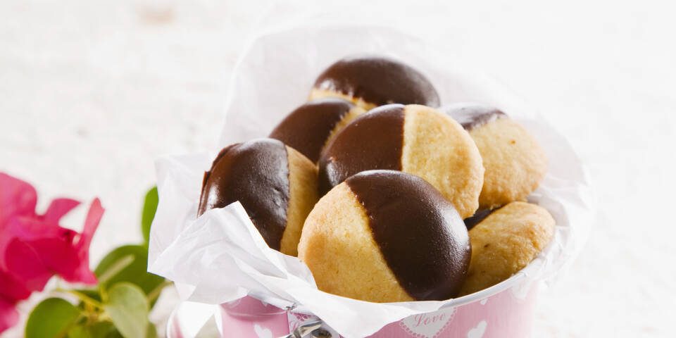 - Zum Verzieren die Schokolade hacken und mit dem Likör über einem heißen Wasserbad schmelzen lassen. Leicht abkühlen lassen und die Kekse jeweils bis zur Hälfte eintauchen. Auf Backpapier legen und trocknen lassen.