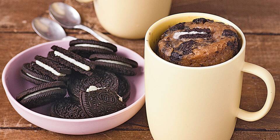 - 1 Minute und 30 Sekunden bei 800 Watt in der Mikrowelle backen. Mit Oreo-Stückchen garnieren. Vor dem Verzehr 1 Minute abkühlen lassen.