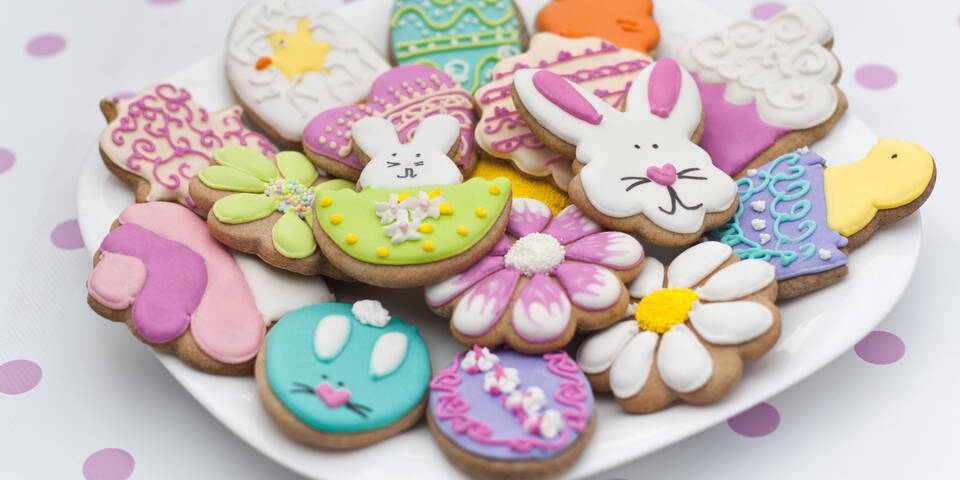 3. Den Backofen auf 180°C Ober-und Unterhitze vorheizen. Ein Backblech mit Backpapier auslegen. Den Teig ca. 3 mm dünn ausrollen und mit einem Ausstecher Eierplätzchen (ca. 5 cm Höhe) ausstechen. Auf das Blech legen und im Ofen in 10-12 Minuten goldgelb backen. Anschließend vorsichtig vom Blech nehmen und auf einem Kuchengitter abkühlen lassen.