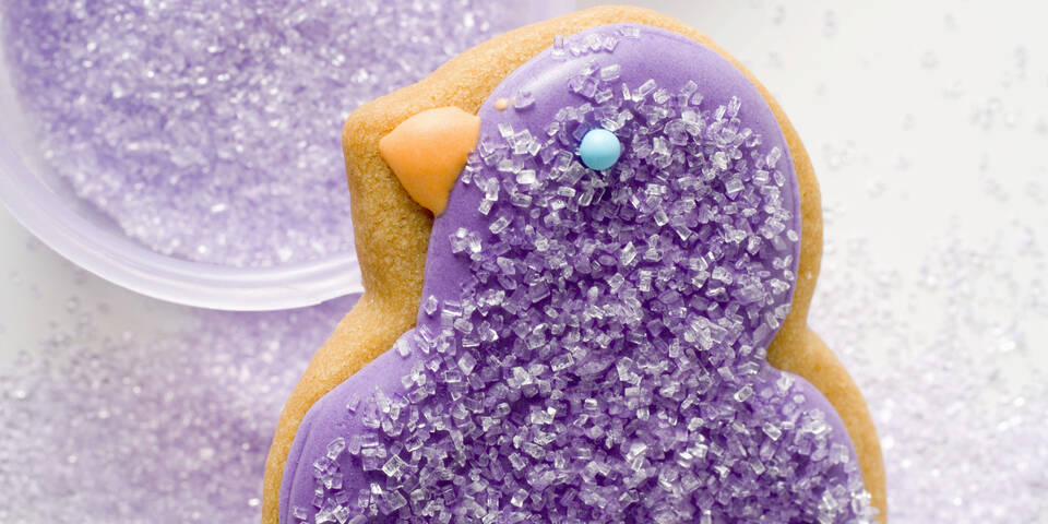 - Den violetten Guss mit violettem Kristallzucker bestreuen und mit einer blauen Zuckerperle (als Auge) verzieren. Trocknen lassen und servieren.