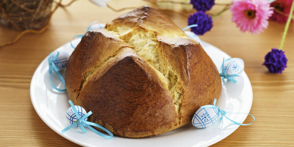 - Den Ofen auf 180 °C Unter- und Oberhitze vorheizen. Den Teig nochmal gut durchkneten und daraus einen Laib formen. Auf ein mit Backpapier belegtes Backblech legen und kreuzweise einschneiden. Den Eidotter mit dem Obers verrühren und damit den Teig bepinseln. Im Ofen ca. 40 Minuten goldbraun backen.