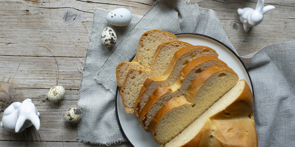 5. Den Staubzucker mit dem Zitronensaft und 2 TL Wasser zu einem Guss verrühren und die Oberfläche damit bestreichen. Die Glasur antrocknen lassen und den Osterzopf noch mit gelben und blauen Zuckereiern und Essblüten garnieren. Die Glasur vor dem Anschneiden vollständig trocknen lassen.