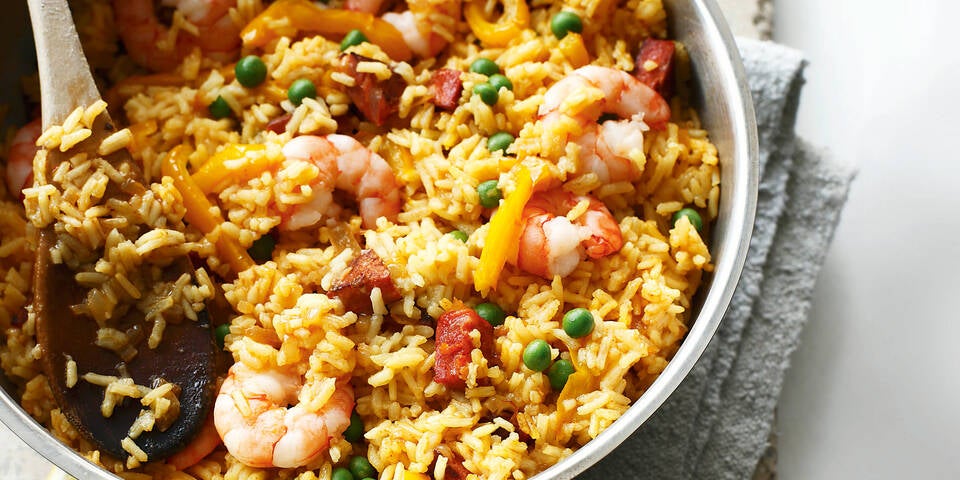 - Garnelen abbrausen und abtropfen lassen. Die Wurst in Stücke schneiden. Die Zwiebel und den Knoblauch schälen und würfeln. Die Paprikaschote waschen, halbieren, putzen und in Streifen schneiden. Die Erbsen auftauen lassen.