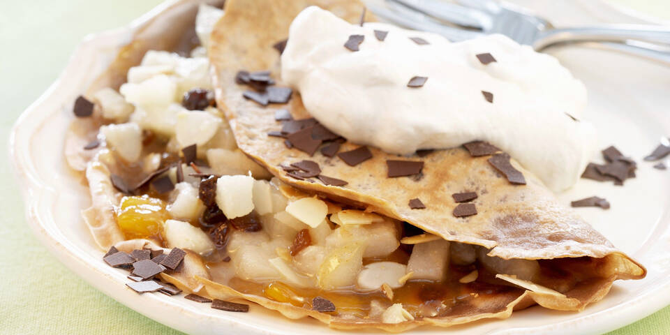 - Jede Palatschinke mit etwas Birnenkompott füllen und auf einen flachen Dessertteller anrichten. Mit den Schokoblättchen bestreuen und mit etwas Obers servieren.