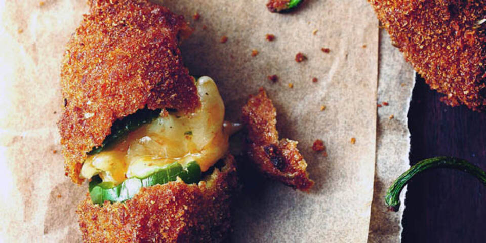 4. Das Öl auf ca. 170 °C erhitzen und die Jalapeños portionsweise 2–3 Minuten goldbraun ausbacken. Auf Küchenpapier abtropfen lassen und servieren.