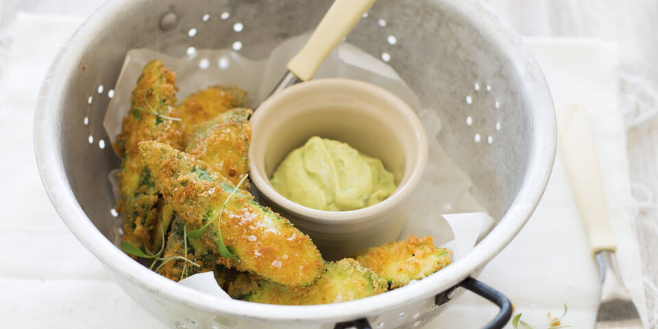 - Die Zucchini waschen, putzen und schräg in 1,5–2 cm dicke Scheiben schneiden. Die Eier in einer Schüssel verquirlen und mit Salz, Pfeffer und Zitronenabrieb würzen. Die Zucchinischeiben im Mehl wenden und durch das Ei ziehen. Mit den Bröseln panieren und im heißen Öl (ca. 170 °C) portionsweise je 3–4 Minuten goldbraun frittieren. Auf Küchenpapier abtropfen lassen.