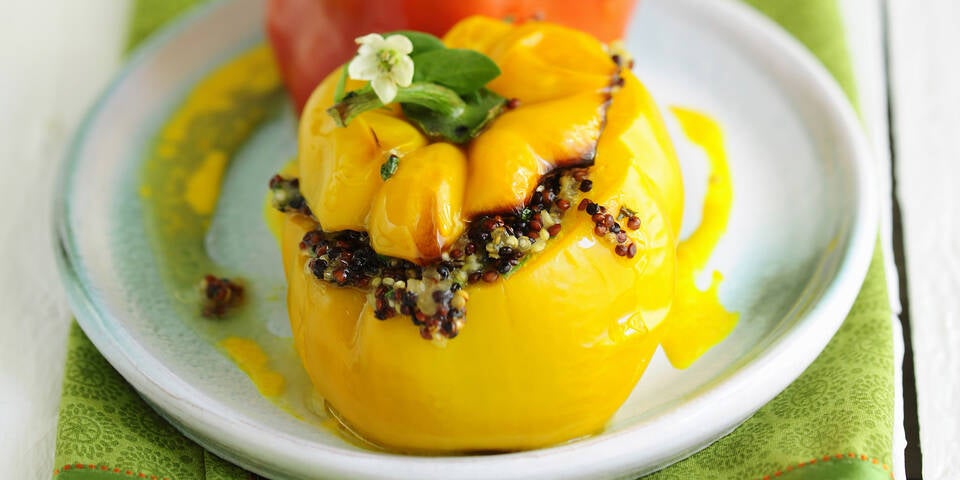 - Die Zwiebel fein hacken und in einem Topf mit dem Öl glasig schwitzen. Mit Quinoa, Koriander, Salz und Pfeffer in die Paprika füllen. Den Deckel aufsetzen und in eine hohe Auflaufform setzen. Danach den Wein angießen und bei 220 °C im Rohr 20 Minuten garen.