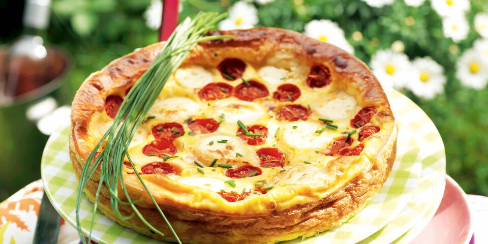 - Die Obersmischung in die Form gießen. Die Paradeiser und den Mozzarella darauf verteilen. Im vorgeheizten Backofen 20–25 Minuten garen, bis die Obersmischung vollständig gestockt ist. Am besten heiß, mit etwas Schnittlauch garniert, servieren. Dazu passt frische Baguette.