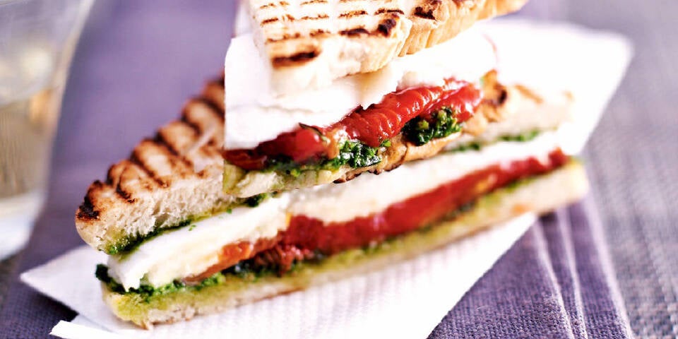 - Die Tramezzini kurz in einer Grillpfanne rösten. Anschließend mit dem Basilikumpüree bestreichen und mit den Paradeiser- und Mozzarellascheiben belegen. Diagonal halbieren und servieren.