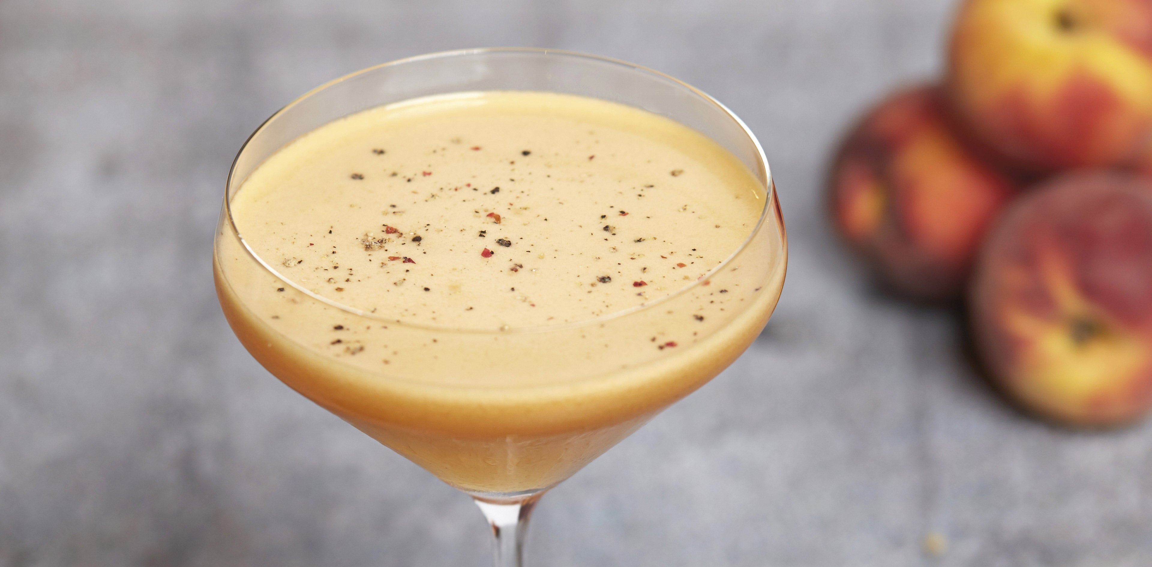 Alle Zutaten außer den Pfeffer in einem Shaker gießen und kräftig schütteln. Den Drink in eine kantige Martinischale abseihen und Pfeffer daruber streuen.