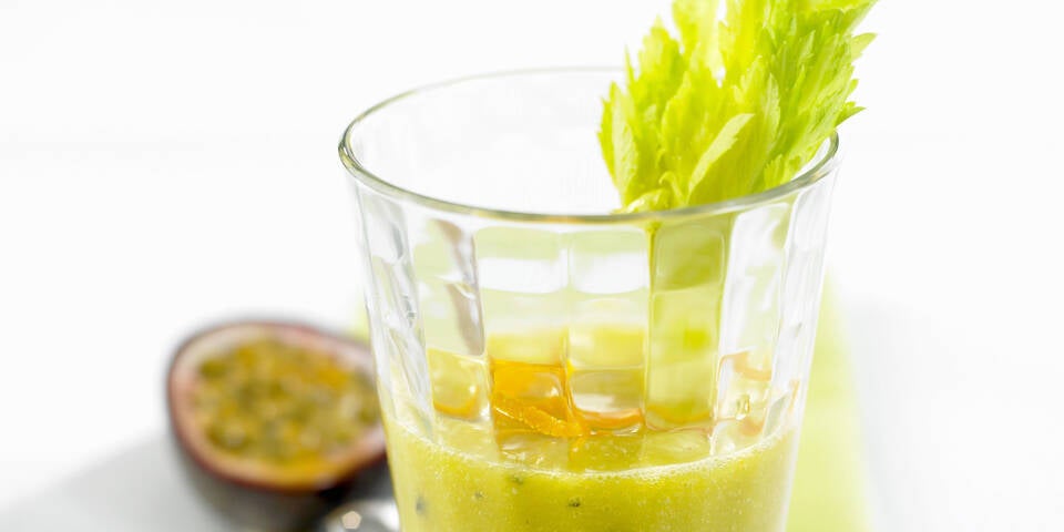 Passionsfrüchte halbieren, mit einem Löffel das Fruchtfleisch herausschaben und durch ein Sieb streichen. Kiwis schälen, Staudensellerie klein schneiden. Alle Zutaten fein pürieren. Den Smoothie auf Eiswürfel in 4 Gläser gießen und mit Orangenzesten garnieren.