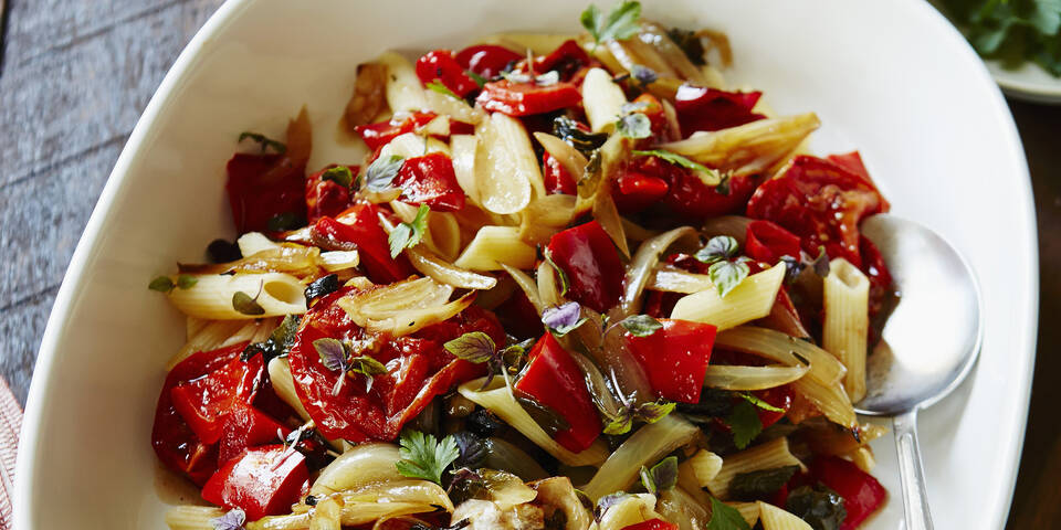 Das Gemüse aus dem Ofen nehmen, mit dem Balsamico beträufeln und abschmecken. Die Nudeln abgießen und gut abgetropft in eine große Schüssel geben. Das Gemüse darüber verteilen und mit den Kräutern garniert servieren.