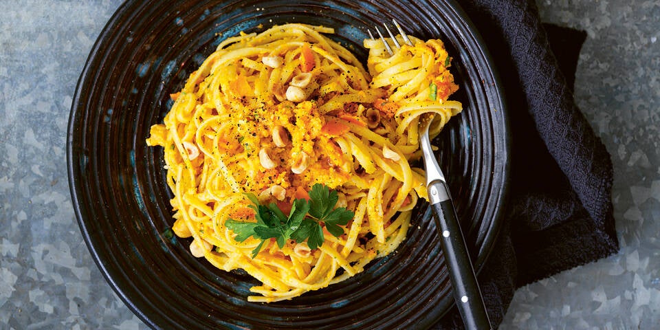1. Das Nudelwasser aufkochen und ordentlich Salz hineingeben. Die Karotte schälen und in Scheiben schneiden. (Wenn Sie sie kochen wollen, dann schneiden Sie sie, nachdem sie eine Weile gekocht hat.) Mit Käse, Nüssen, Knoblauch und Olivenöl in eine Schüssel geben. Halbwegs glatt rühren und mit Salz und Pfeffer abschmecken. Wenn das Pesto cremiger sein soll, geben Sie mehr Öl dazu.