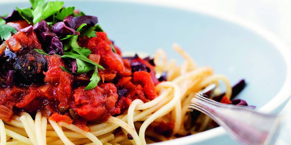 - Die Pasta in einem Sieb abtropfen lassen und in eine Schüssel geben. Sauce und Fisch über der Pasta verteilen. Mit gehackter Petersilie bestreuen und evtl. mit weiteren gehackten Oliven bestreuen, falls vom Vortag welche übrig sind.