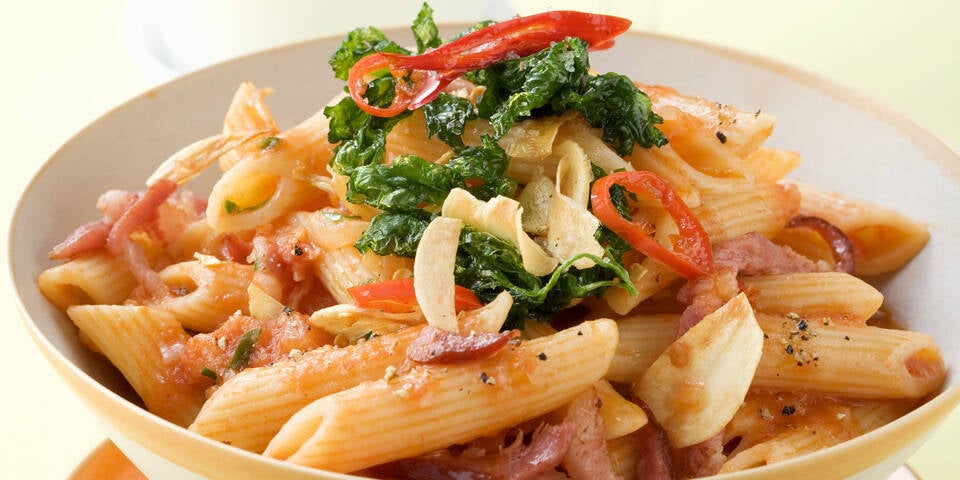 - Die Nudeln in Salzwasser al dente garen. Die Paradeiser brühen, häuten, vierteln, entkernen und in Würfel schneiden. Die Chili waschen und in Ringe schneiden. Die Zwiebel und den Knoblauch abziehen, die Zwiebel in Würfel und den Knoblauch in Scheiben schneiden.