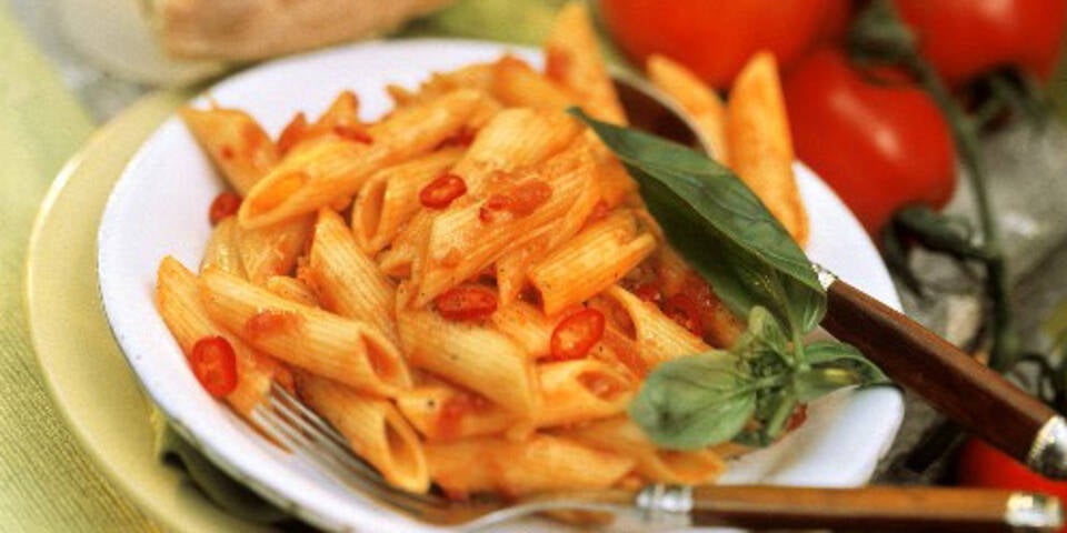 - Die Zwiebel und Knoblauch schälen und beides fein würfeln. Zusammen im heißen Öl glasig anschwitzen. Die Chili und Paradeiser untermengen und ca. 5 Minuten cremig köcheln lassen. Die abgetropften Nudeln unterschwenken und einige Minuten in der Soße kochen.