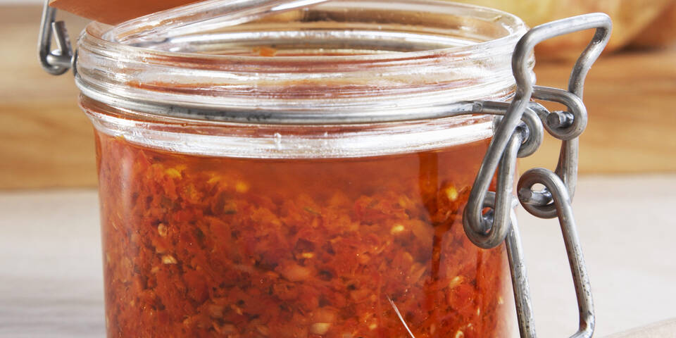 - Beides zusammen mit Ingwer, Knoblauch, Paprika und Salz unter die zerkleinerten Chilis mengen und in ein vorbereitetes (steril abgekochtes) Glas füllen. Mit dem restlichen Öl übergießen, sodass alle Zutaten komplett bedeckt sind. Das Piri-Piri hält sich kühl und dunkel gelagert etwa zwei Wochen.