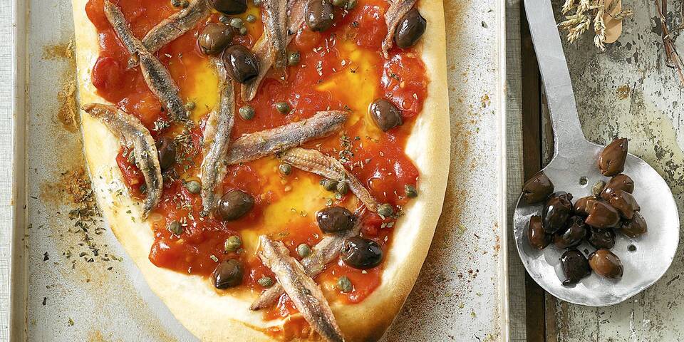 - Mit Zwiebeln, Oliven, Paradeisern und Sardellenfilets belegen. Im Backofen ungefähr 25 Minuten garen. Mit Thymian garniert servieren.