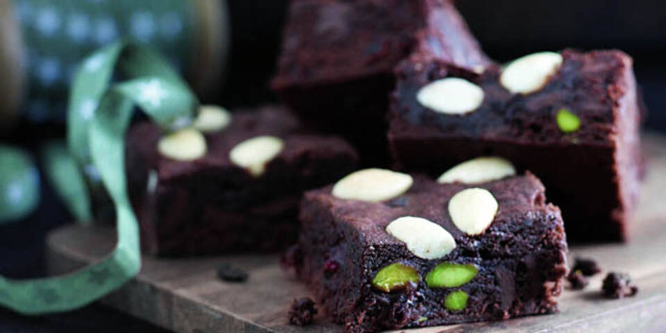2. Die Eier gut verquirlen und die Butter einrühren. Das Mehl, Backpulver und den Kakao dazu sieben. Den Zucker, Vanillezucker, die Schokotropfen, Pistazien und Cranberrys dazugeben und nur kurz untermischen.