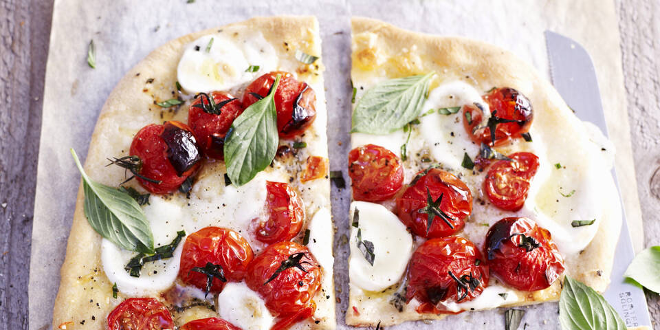 - Den Teig noch einmal gut durchkneten und in zwei Portionen teilen. Diese zu dünne Fladen ausrollen und auf ein mit Backpapier belegtes Backblech legen. Mit den Mozzarellascheiben und Paradeiser belegen, mit Basilikumstreifen bestreuen, salzen, pfeffern, mit etwas Olivenöl beträufeln und im vorgeheizten Ofen ca. 20 Minuten backen.