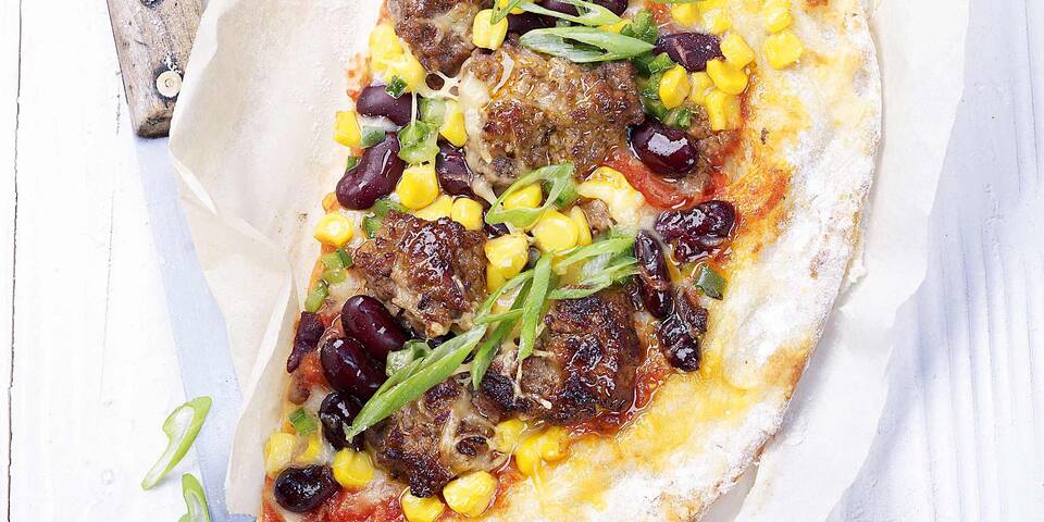- Die Bällchen flach drücken und auf den Paradeisern verteilen. Mit den Bohnen und dem Mais bestreuen, den Käse darüber verteilen und mit dem Papier vorsichtig auf die heißen Backbleche ziehen.