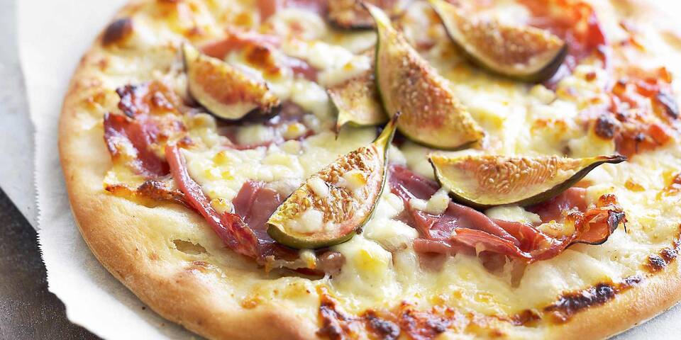 - Mit dem Schinken belegen und den Käse darauf verstreuen. Die Feigenspalten darauf verteilen und im Backofen ca. 20 Minuten garen, bis die Teigränder goldbraun gebacken sind.