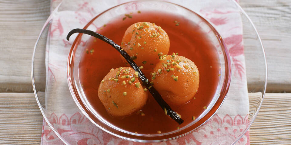 - Die Marillen überbrühen, abschrecken und häuten. Den Wein mit dem Apfelsaft, Zitronensaft, der aufgeschlitzten Vanilleschote und dem Zucker aufkochen lassen. Etwa 10 Minuten leise köcheln lassen und die Marillen dazugeben.